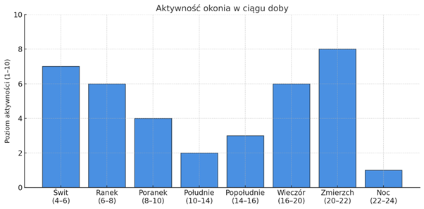 Poniższy wykres pokazuje orientacyjny rytm dobowej aktywności okonia. Trzeba pamiętać, że może się on różnić w zależności od zbiornika, pogody czy presji wędkarskiej.